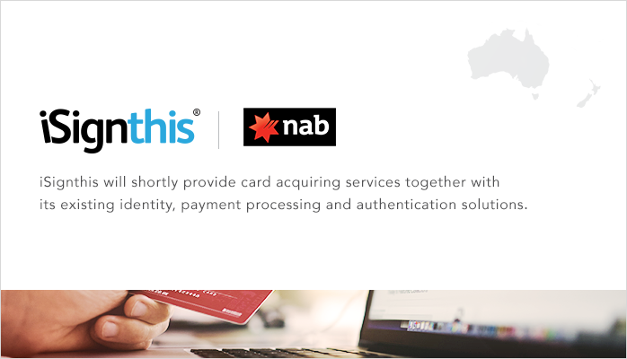 The agreement with National Australia Bank (ASX:NAB) enables iSignthis to use card acquiring services together with its identity, payment processing and authentication solutions. NAB will act as the Acquirer for transactions processed by iSignthis on behalf of our merchant customers, with both parties taking a share of the merchant fee.