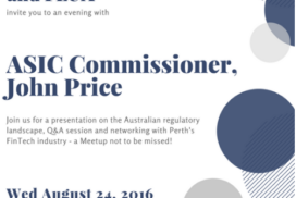 FinTech Perth welcomes ASIC Commissioner, John Price to our August Meetup. Join Fintech Perth us for a presentation on the Australian regulatory landscape, Q&A session, and networking with Perth’s FinTech industry – a Meetup not to be missed! Wednesday, August 24th 5:45pm FLUX, 191 St Georges Terrace, Perth Please pass this event to your networks and … Continue reading FinTech Perth welcomes ASIC Commissioner, John Price