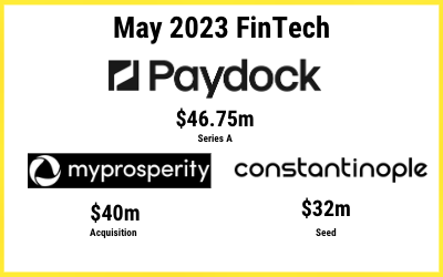 My Prosperity was acquired by Hub24 for $40m (read more). Â PayDock, a fintech platform which originated in Sydney but which is now focussing heavily on the UK market has closed a massive $46.75m Series A funding round (read more). Â Constantinople, a software fintech, has just announced that it completed a $32m seed round late last year (read more.)