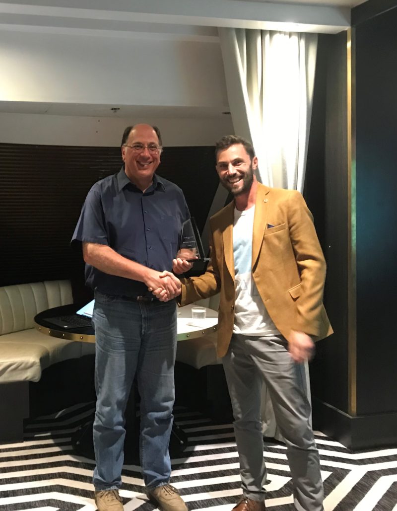 Raf presenting the Award for Most Active Angel Group to Jordan Green from the Melbourne Angels